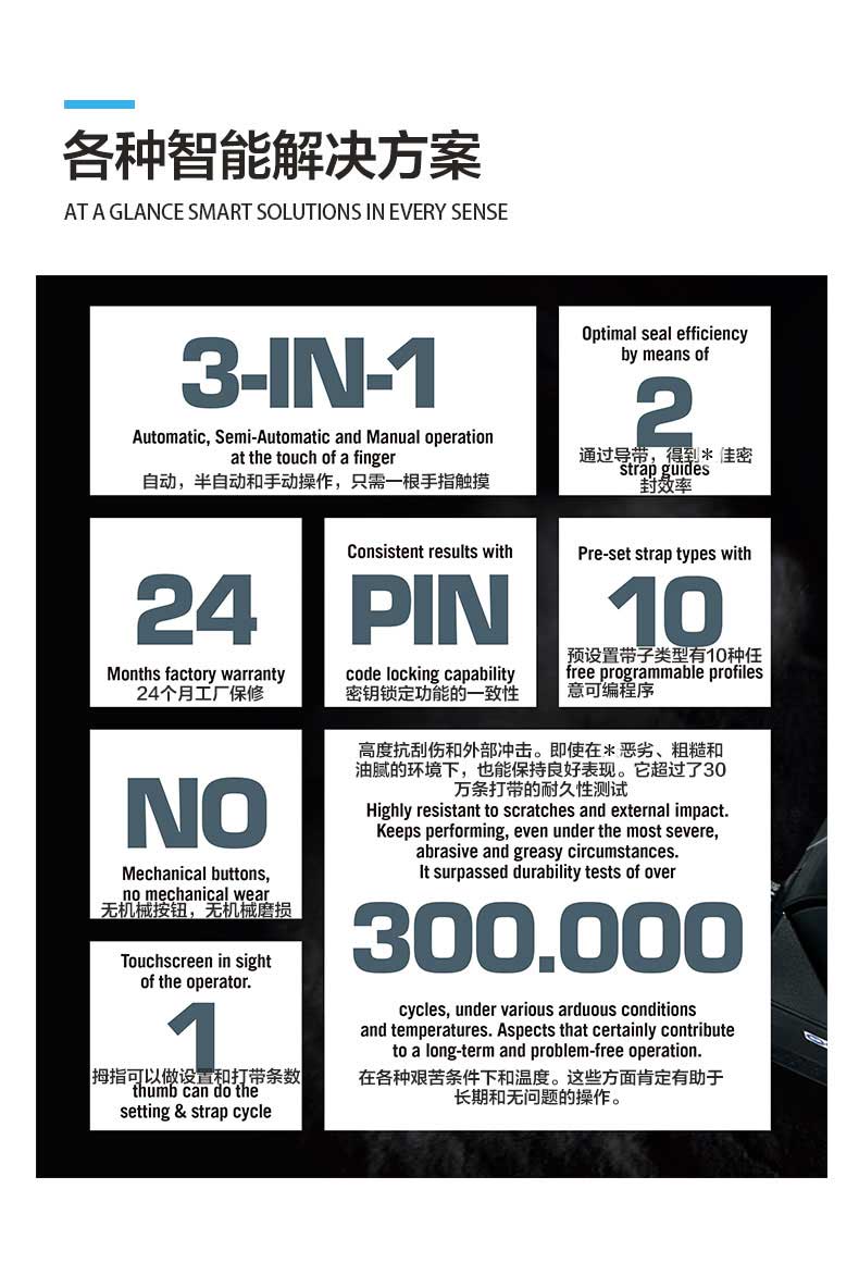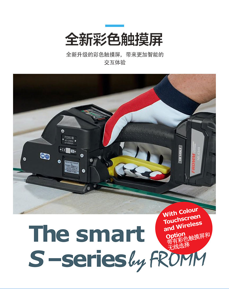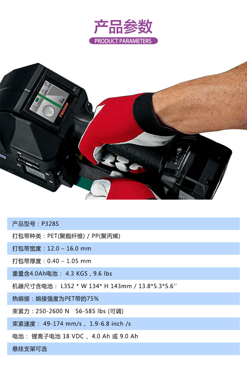 P328S手提電動打包機PET塑鋼帶全自動捆包特質:聚酯(PET)和聚丙烯(PP)平原和壓花捆包尺寸:寬度10 0 - 16 0毫米 3 8 - 5 8厚度0 40