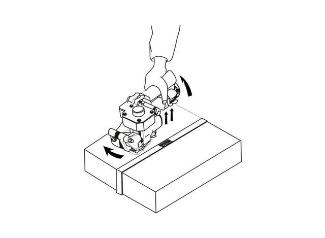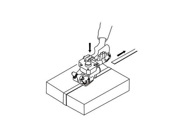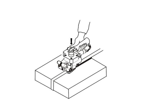 2,機器插入熱熔帶右手握住手柄和張緊器以保證緊輪與壓板掛齒間張開最大。將熱熔帶的上,下部分同時插入打包機中。