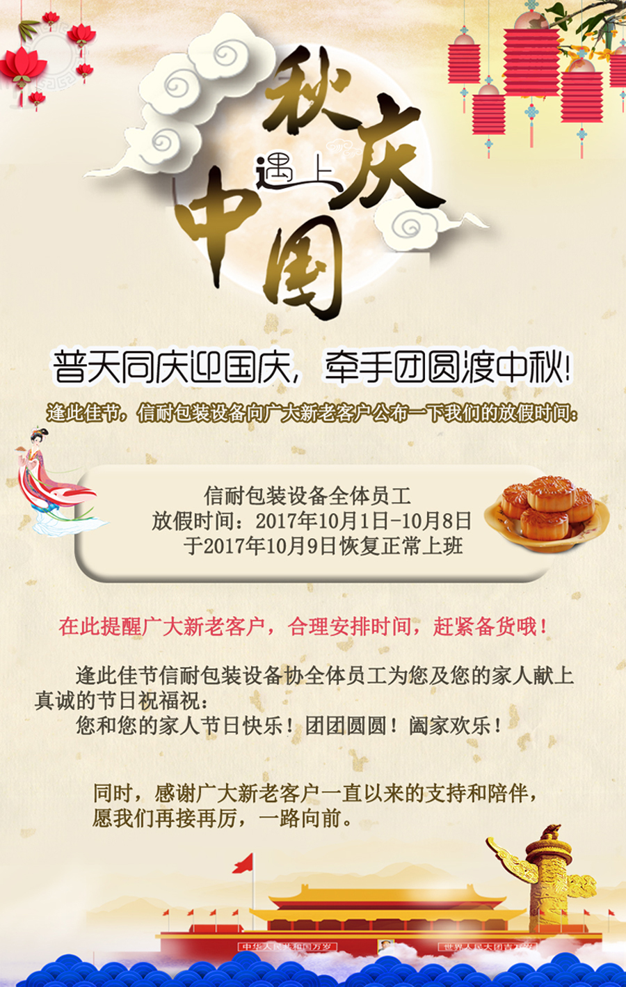 2017年10月1日至10月8日放假,10月9日正常上班,需要機器和維修的客戶請及時安排,以免耽誤您的使用,謝謝您的配合!